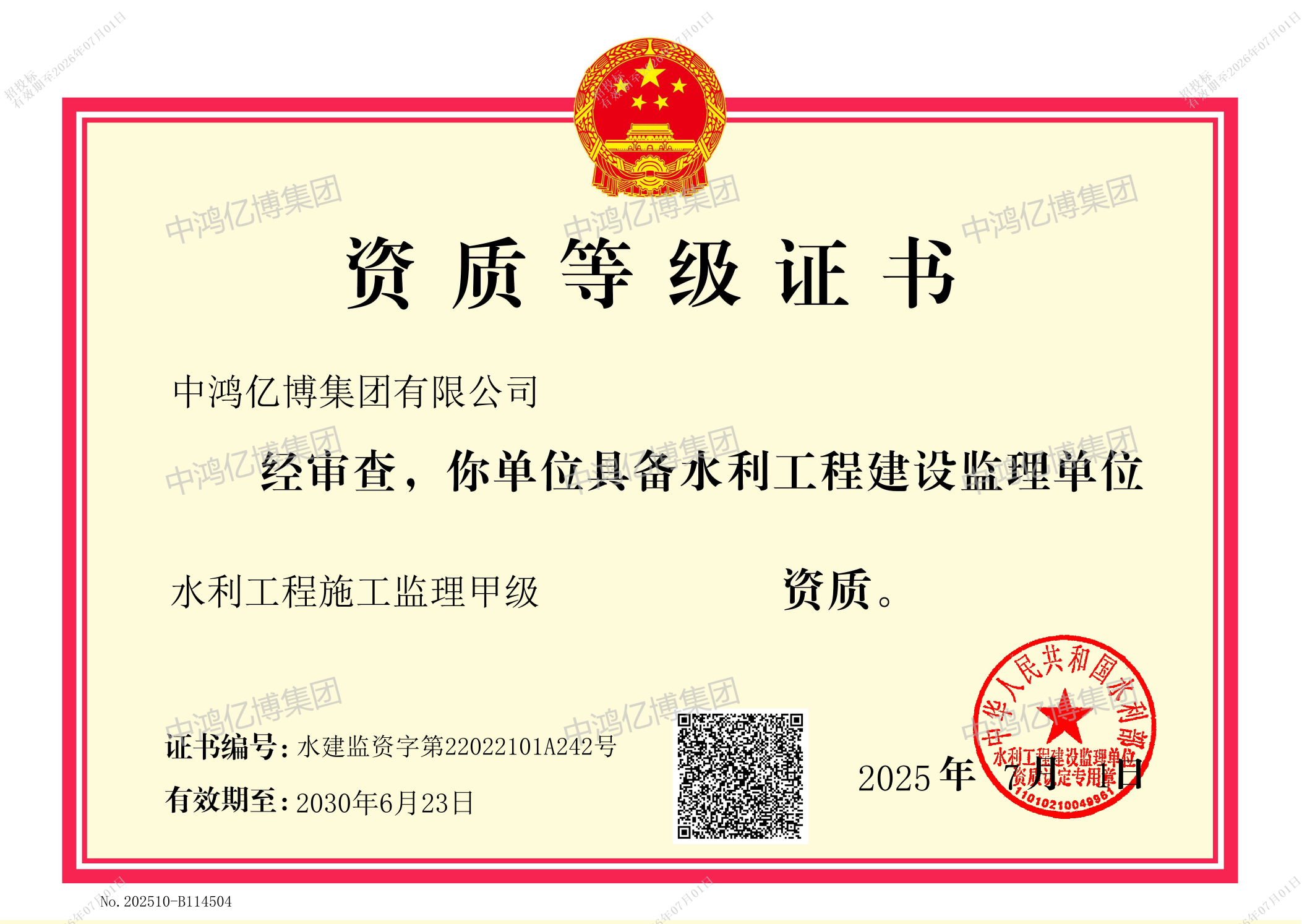 2014年11月取得住建部水利水电工程、农林工程、电力工程监理甲级资质