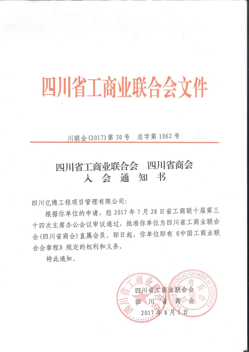 四川省工商业联合会 四川省商会入会通知书