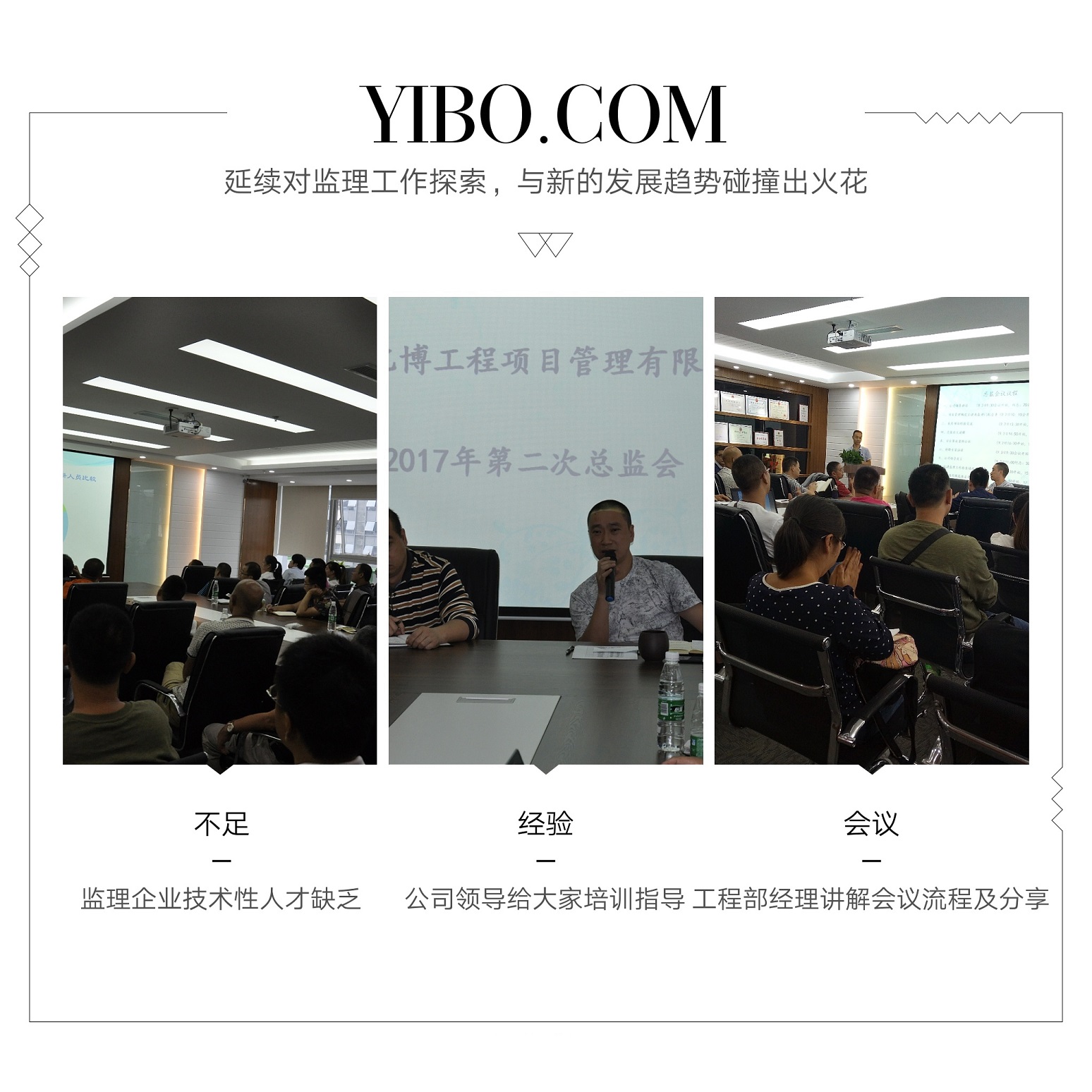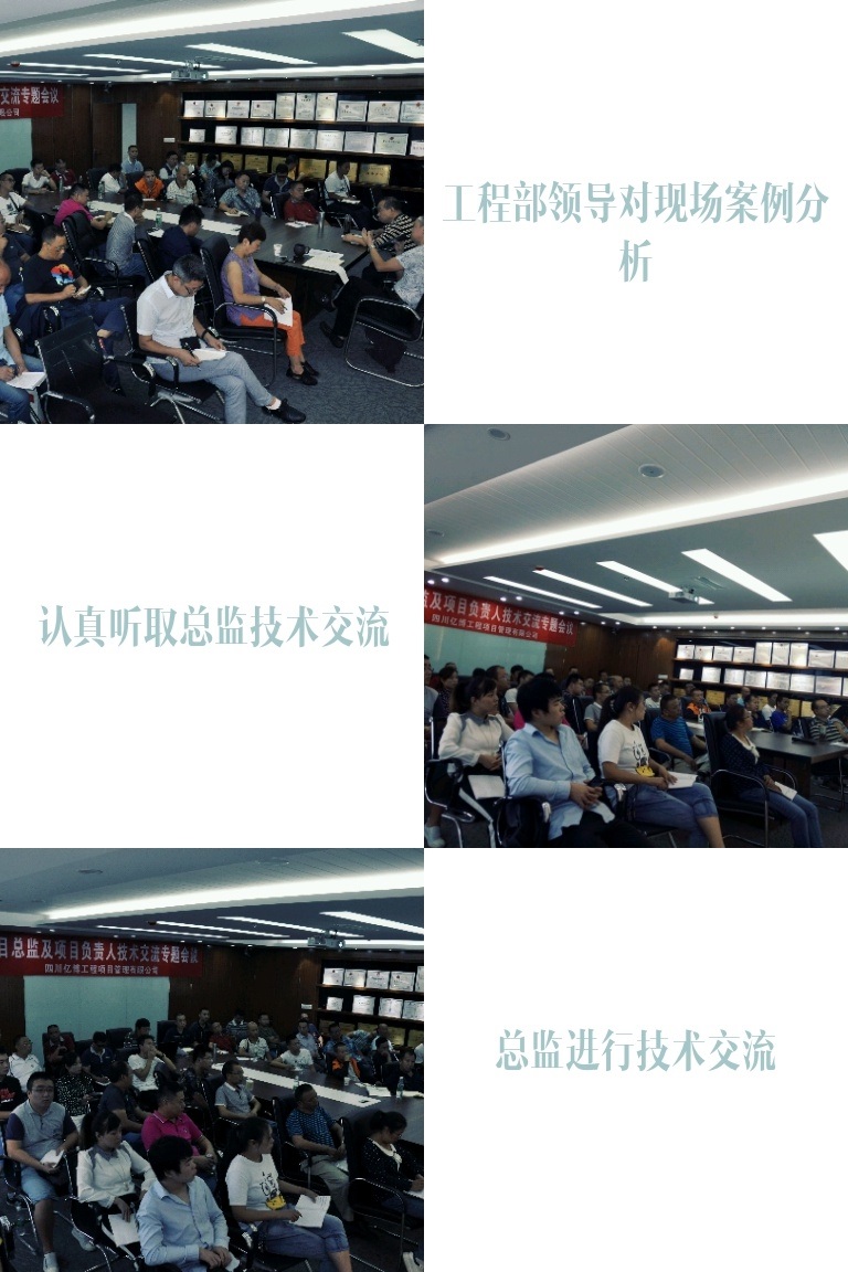 2017年92日,公司在总部召开了为期2天的“项目总监及项目负责人技术交流专题会”,会议特邀专家对当前建筑市场的形势、发展趋势、监理行业现状及未来发展进行了深入透彻的分析与讲解,提醒我们所有监理人必须要认清形势、要有时代紧迫感和忧患意识。总工办也围绕会议主题组织开展了“建筑安全事故案例分析、专题论文探讨、监理工作经验交流、监理工作缺陷分析和优秀范例品鉴”等相关会议事项,并就下一步监理工作质量、监理工作信息化管理、监理企业信用评价管理和工程全过程咨询工作等方面做出了详细部署与安排。