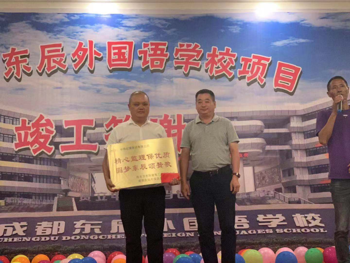 在竣工庆典上,建设单位为公司颁发了“精心监理保优质,圆梦东辰颂赞歌”奖牌,项目总监廖祥斌被建设单位评为“创校功勋人物”,得到施工单位及建设单位的一致好评;他们是中鸿亿博集团有限公司廖祥斌、邹杉、鲁翱翔、杨斐、李小彬、李杨、朱维璋、任明、陈林、曾西勇、罗玉君。为东辰外国语学校项目监理部的各位同仁喝彩!作为亿博人希望中鸿亿博集团有限公司蓬勃发展,蒸蒸日上!