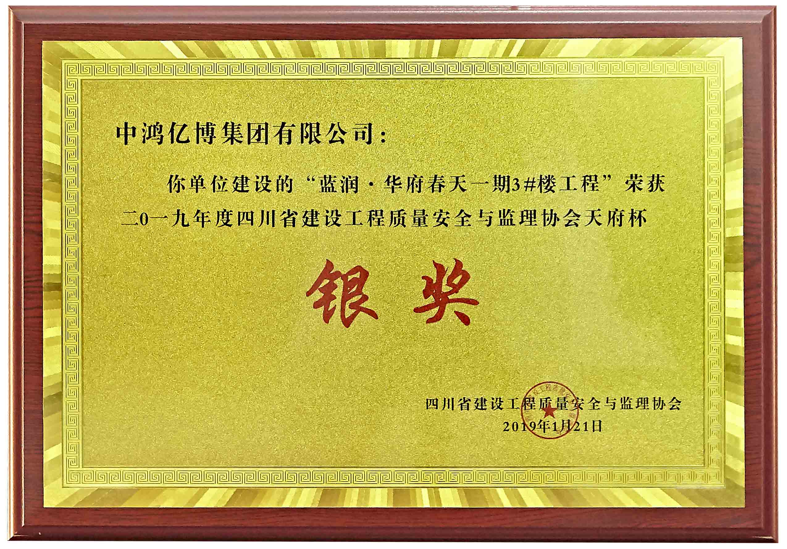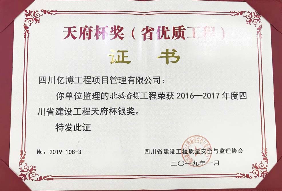 “天府杯”是四川省建筑行业建设工程质量的最高荣誉奖,天府杯分为金奖和银奖其工程质量应达到省内一流水平。2019年9月,来自四川省建设工程质量安全与监理协会文件(川建质安监协[2019]6号)通报信息,我司监理承建的“雅安市文化中心项目二期工程(多功能演艺厅及配套商业)”获评表彰为2016~2017年度四川省建设工程天府杯工程(省优质工程)金奖,北城香榭工程蓝润·华府春天一期3#楼工程获评表彰为2016~2017年度四川省建设工程天府杯工程(省优质工程)银奖。