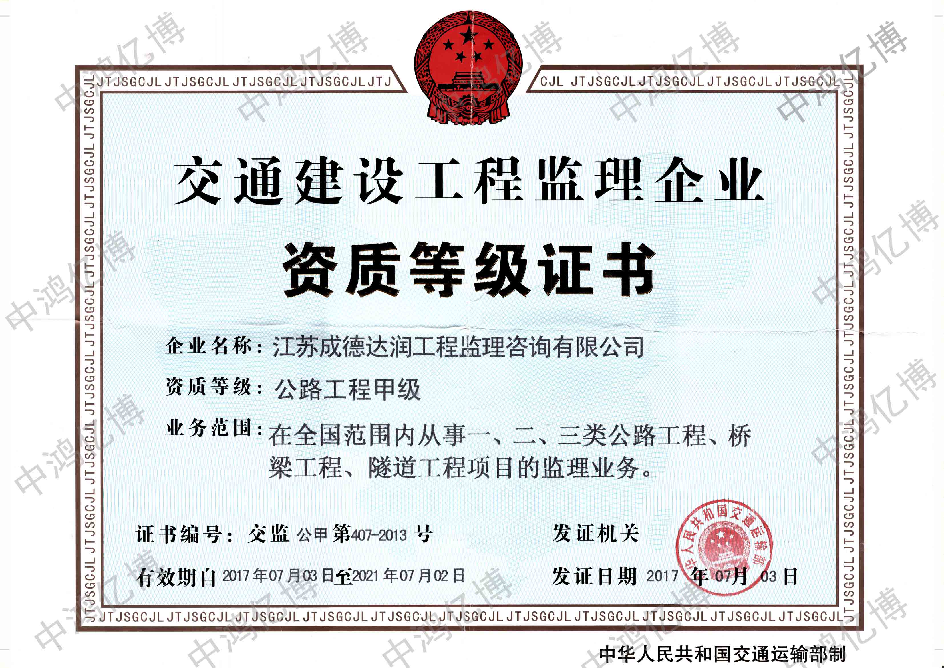 江苏成德达润工程监理咨询有限公司成立于2010年7月,注册资金480万元人民币。经营范围包括公路工程、水运工程监理、咨询服务,现持有交通部颁发的公路工程监理甲级资质证书,于2020年7月成为中鸿亿博集团有限公司全资子公司。