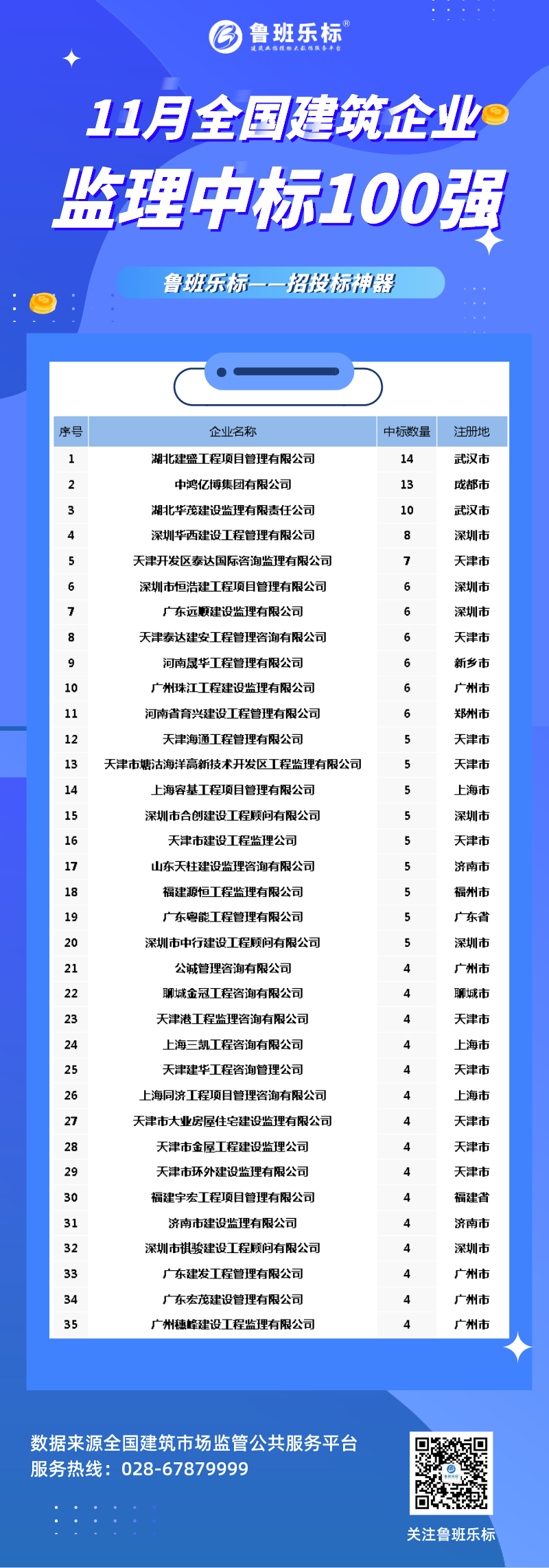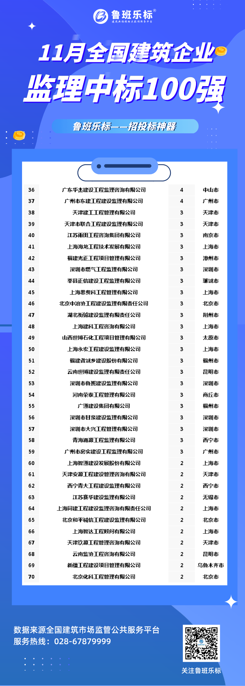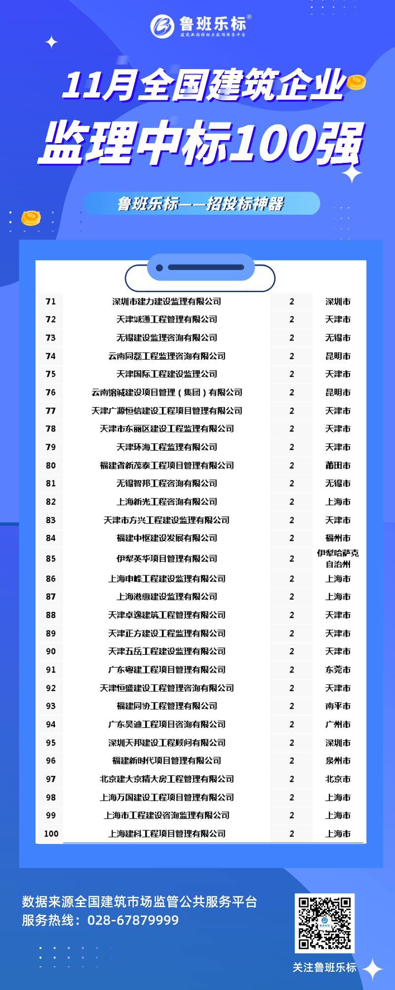 2020年11月全国建筑企业监理中标100强!