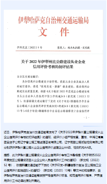集团全资子公司获评伊犁州直公路从业企业信用评价“监理企业和检测机构AA级”