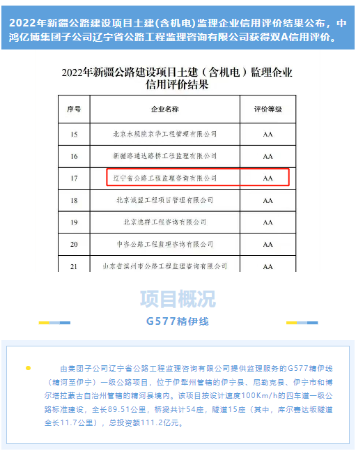 喜报!集团子公司辽宁公路监理在新疆获得双A信用评价