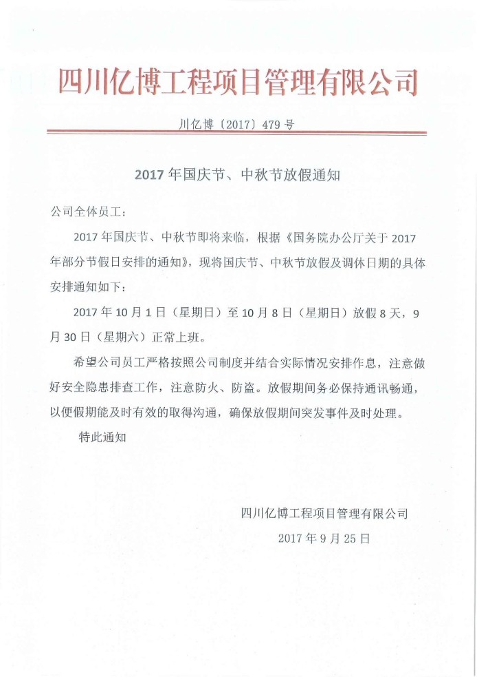 2017年国庆节、中秋节放假通知