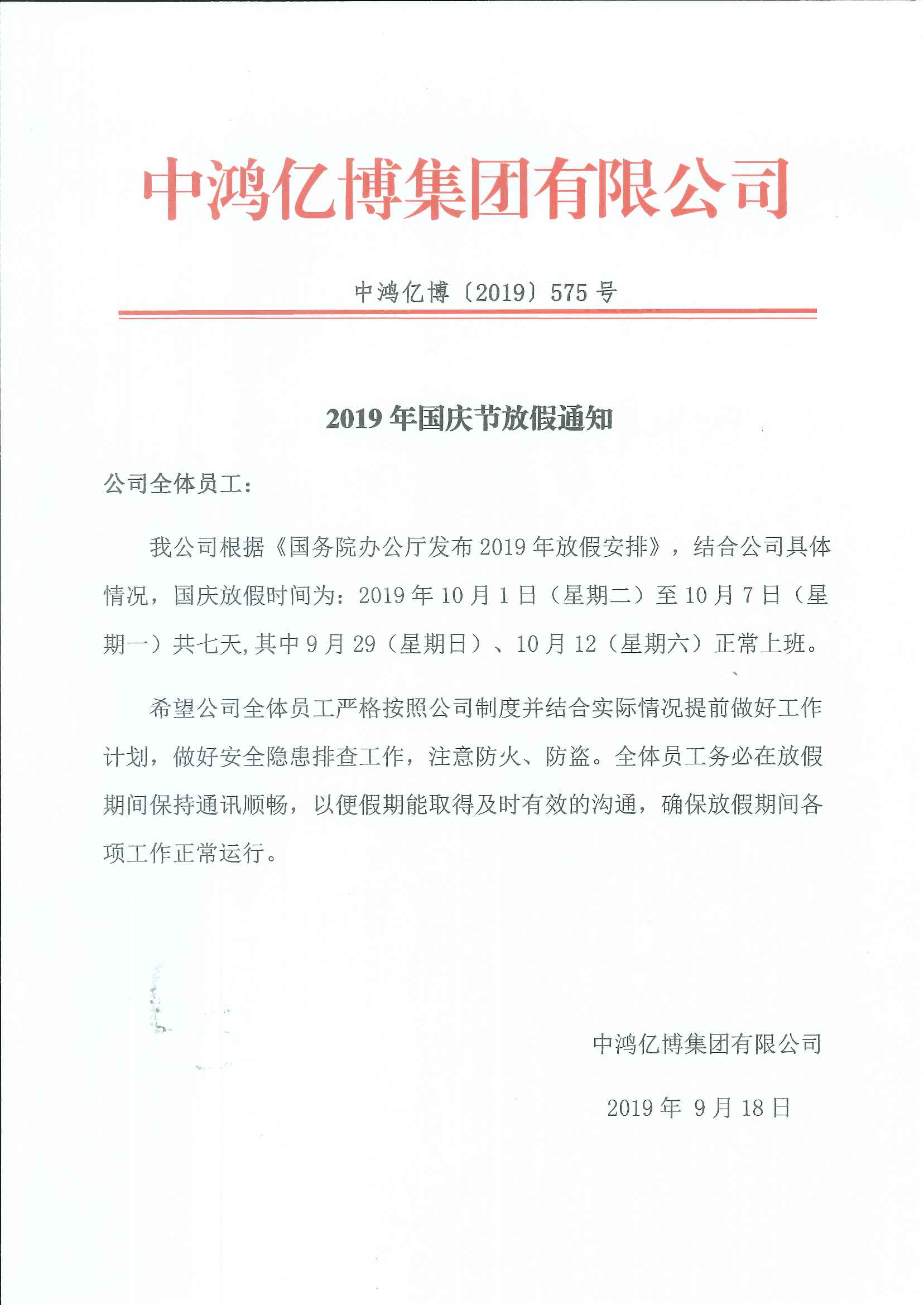 2019年国庆节放假通知
