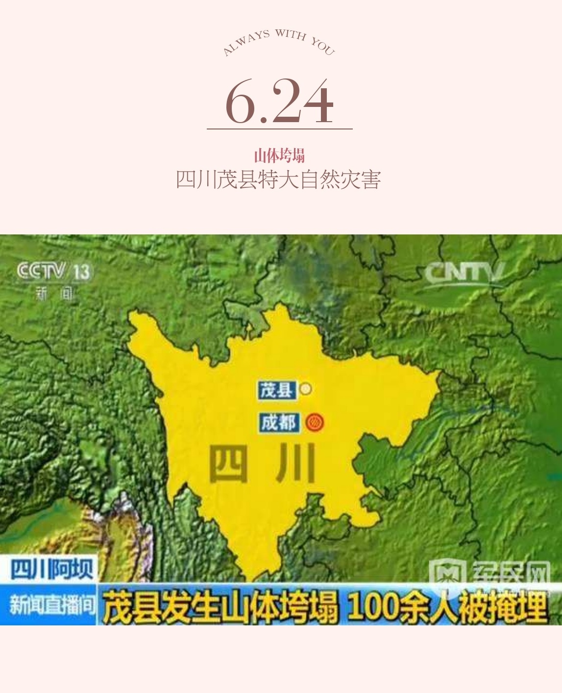 北京时间6月24日4时许,四川省茂县叠溪镇新磨村突发山体高位垮塌,40余户100余名群众被掩埋。此次特大自然灾害。
