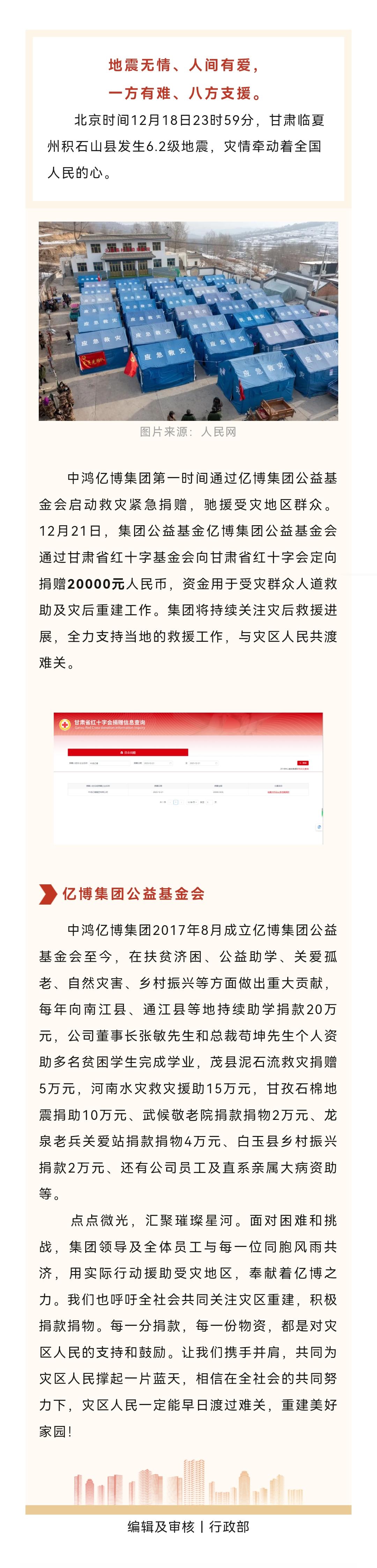 亿博公益丨中鸿亿博集团向甘肃积石山县6.2级地震灾区捐款